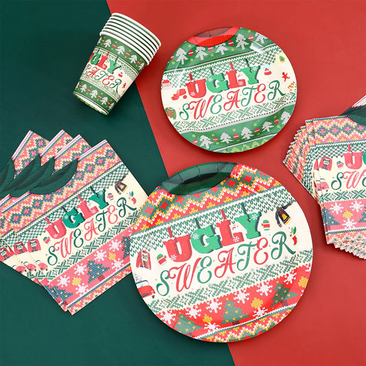 2024 Christmas Ugly Sweater Theme Party Disposable Tableware Paper Plates Napkins